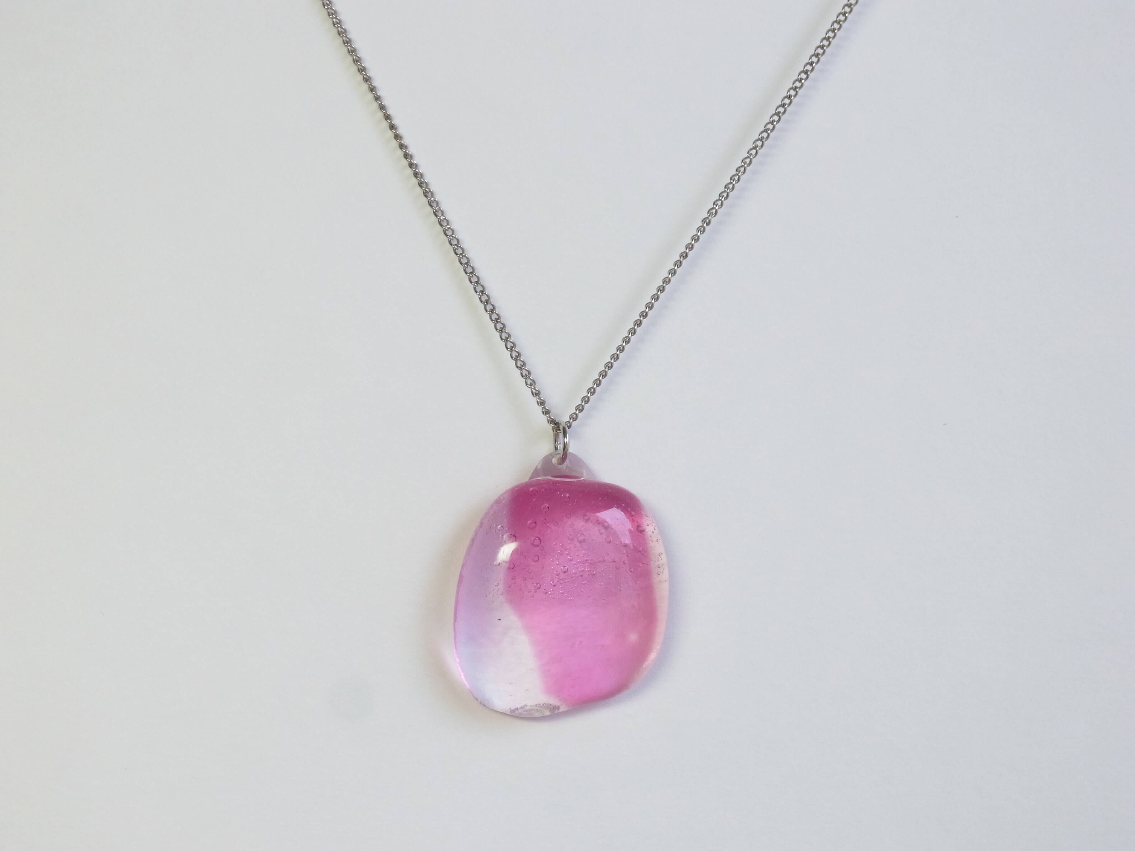 その透明色のガラスを大切にするために、それに合わせたガラスとチェーンをつなぐ部品も一点一点手作りしています。