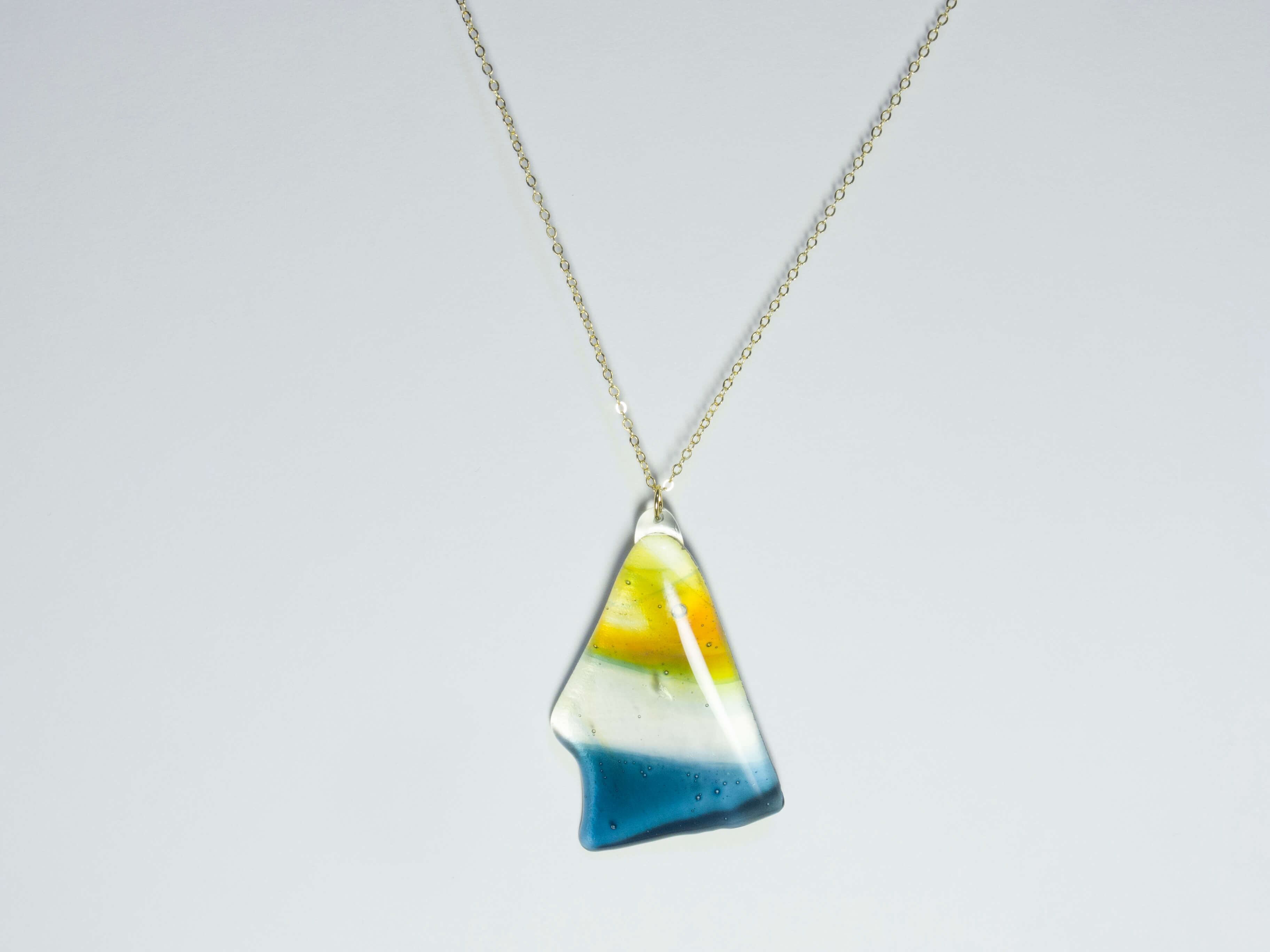 透明地のガラスに合うようにガラスとネックレスチェーンの繋ぎのパーツも透明色で、ネックレストップの良さを尊重して1点ずつ手作りしています。