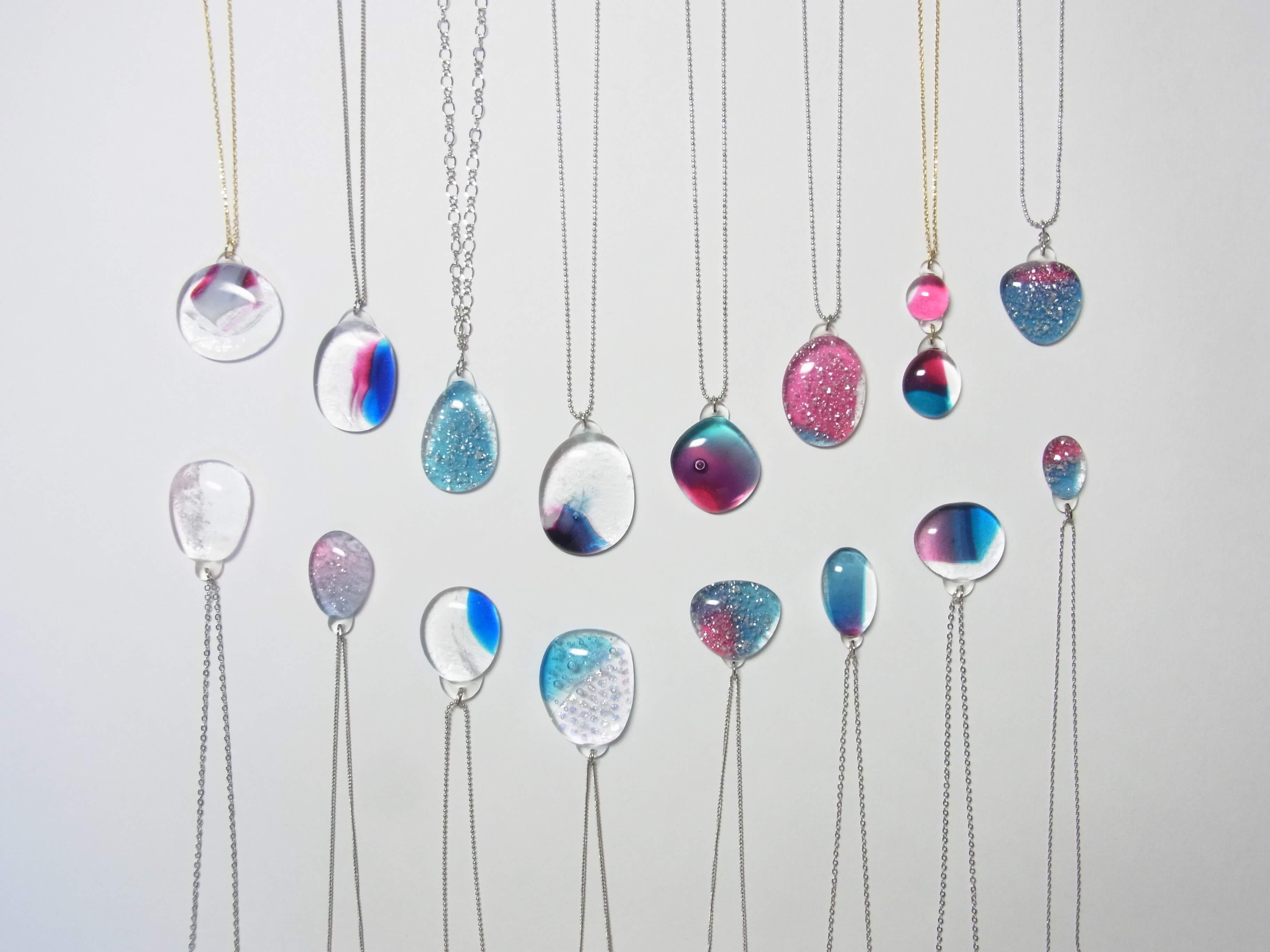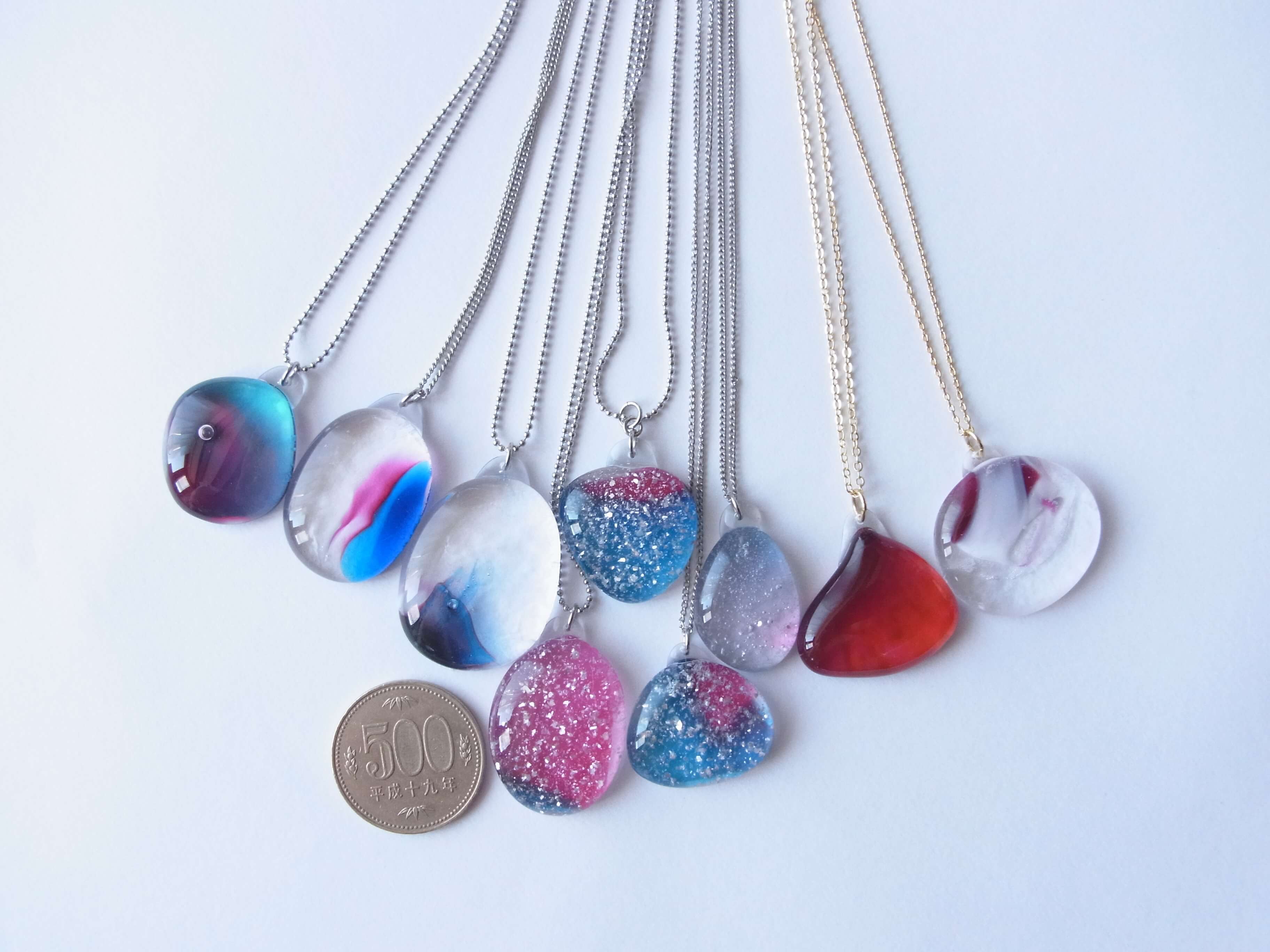 透明地のガラスに合うようにガラスとネックレスチェーンの繋ぎのパーツも透明色で、ネックレストップの良さを尊重して1点ずつ手作りしています。